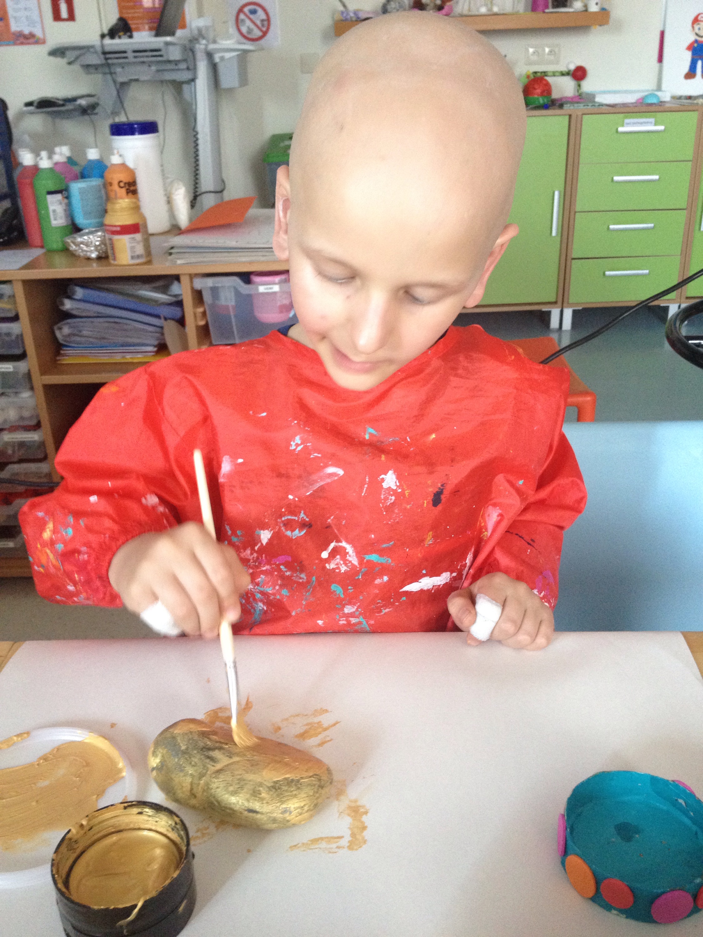Tijdens deze recordtijd slaagde de pedagogisch begeleidster erin Lucas èn een reeds begonnen knutselwerkje te doen afmaken èn een nieuw te laten maken. Want als een echte alchemist transformeerde Lucas een steen in een klom goud.