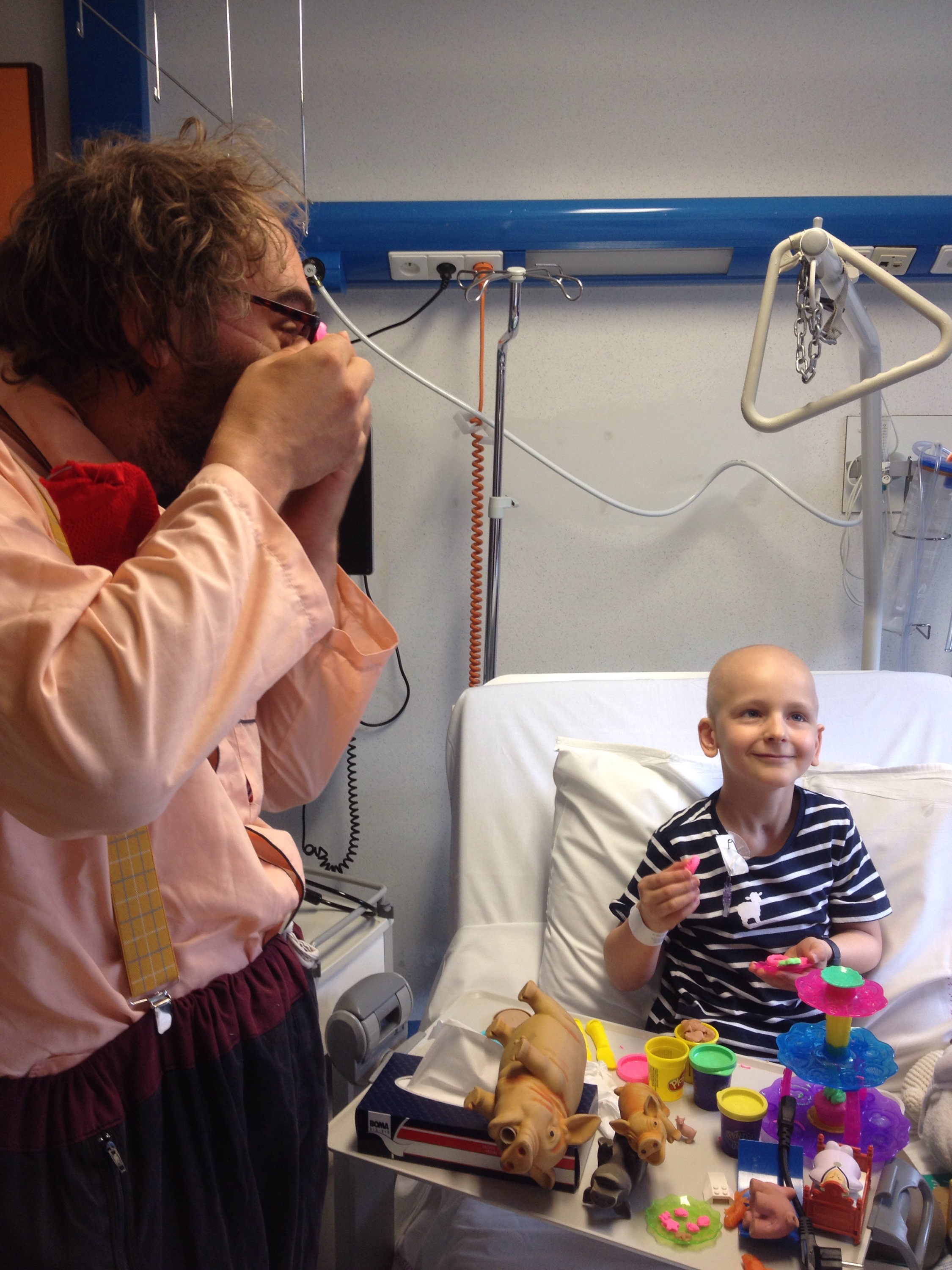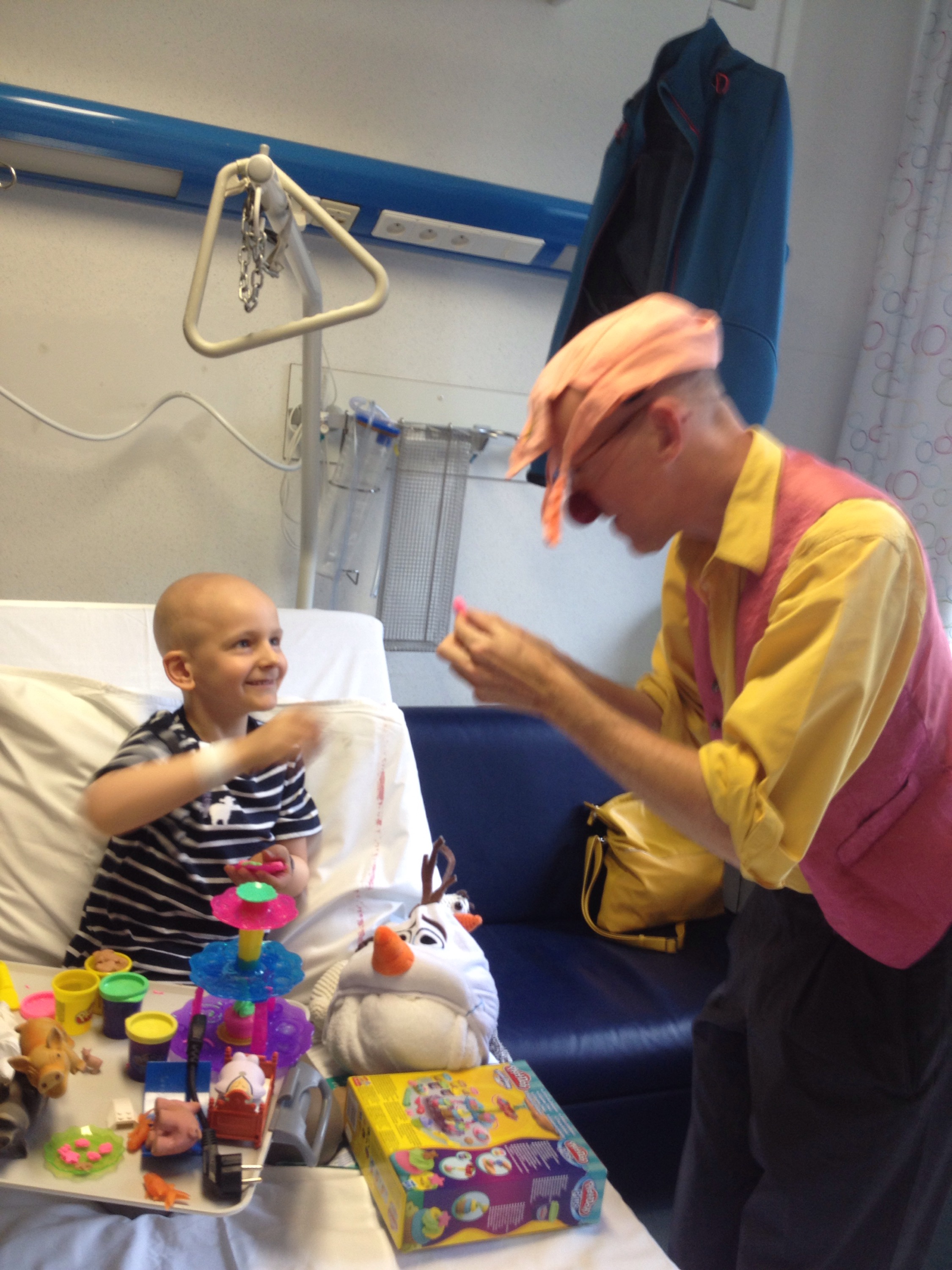 Deze ochtend trokken we weer maar eens met een volle koffer naar Gasthuisberg voor een derde poging om chemo 6 op te starten. Het was druk op de afdeling, maar we hadden wel al meteen een kamer ter beschikking en er werd ookal meteen bloed genomen. Het lange wachten op de resultaten werd gelukkig onderbroken door een hilarisch bezoek van de cliniclowns en een grote bak lego en playmobil in de speelzaal.