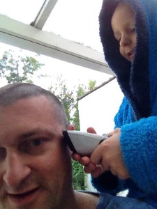 Een haarknipbeurt voor grote broer, inspireerde Lucas gisteravond om kappertje te spelen. Het was reeds bedtijd, dus beloofden we dat hij zich deze morgen nog eens op het haar van papa mocht uitleven. Stiekem hoopten we natuurlijk dat na het slapen de goesting zou over zijn. Helaas, een hyperactieve en dolenthousiaste Lucas trok een half slapende papa deze ochtend kordaat uit bed. En alsof dat nog niet genoeg was, lag beneden het haarknipmateriaal reeds gebruiksklaar uitgestald. Zelfs het ontbijt moest worden uitgesteld. Een heel vreemd begin van de dag: een ochtendlijke knipbeurt op de nuchtere maag buiten op het terras.