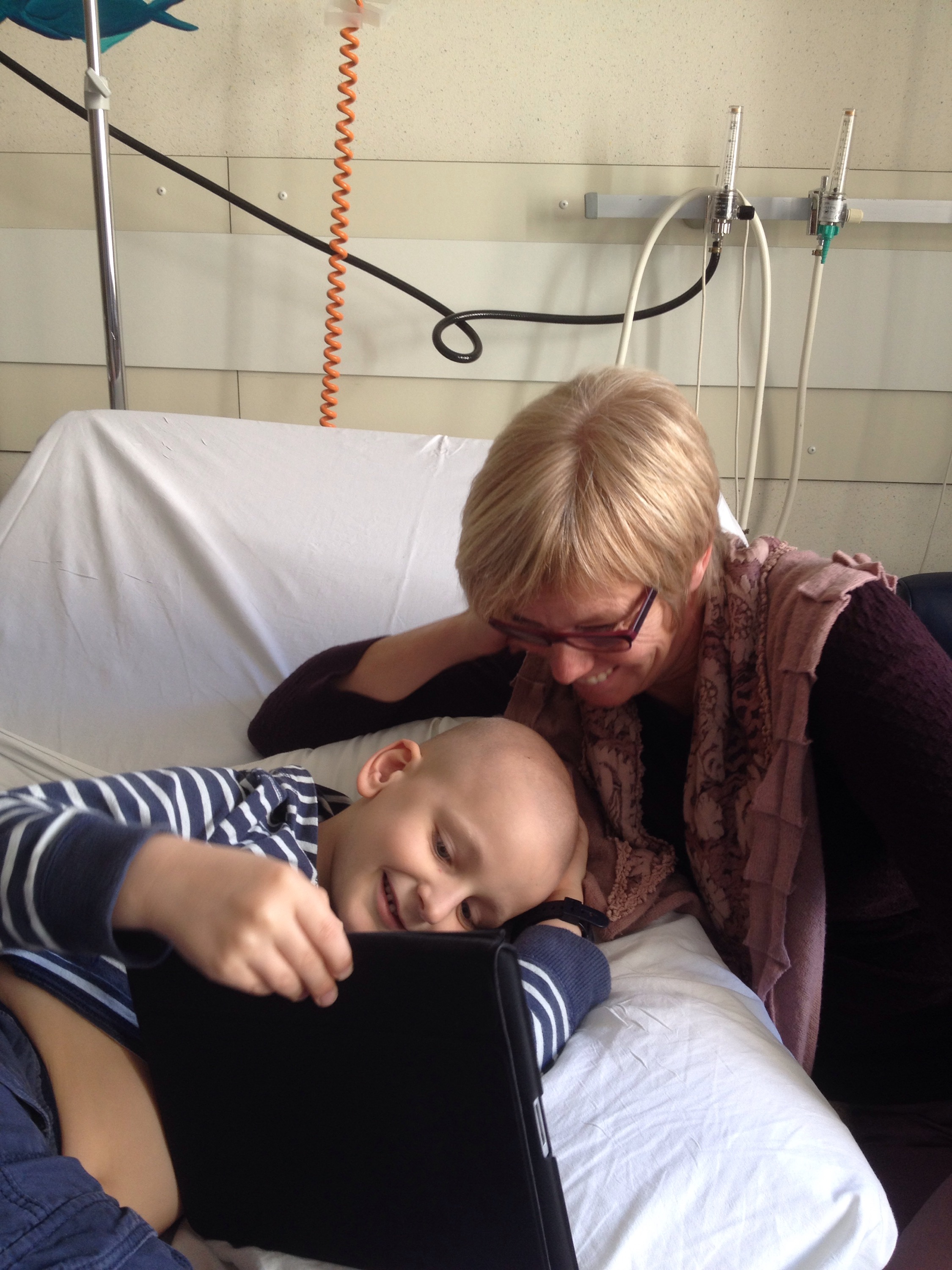 Vandaag gingen we nog eens naar Gasthuisberg voor chemo. Het bleek zo druk op Dagzaal dat we doorverwezen werden naar de afdeling kinderoncologie. Hoewel we vlak naast de speelzaal lagen, kon Lucas er toch niet echt zijn draai vinden. We moesten lang wachten, eerst op het aanprikken en de bloedname en vervolgens op de resultaten. Gelukkig hadden we heel goed gezelschap, want Lucas’ juf Hilde, die normaal gezien op vrijdag haar huisje poetst, liet voor een keertje haar zwabber in de berging en kwam met ons mee.