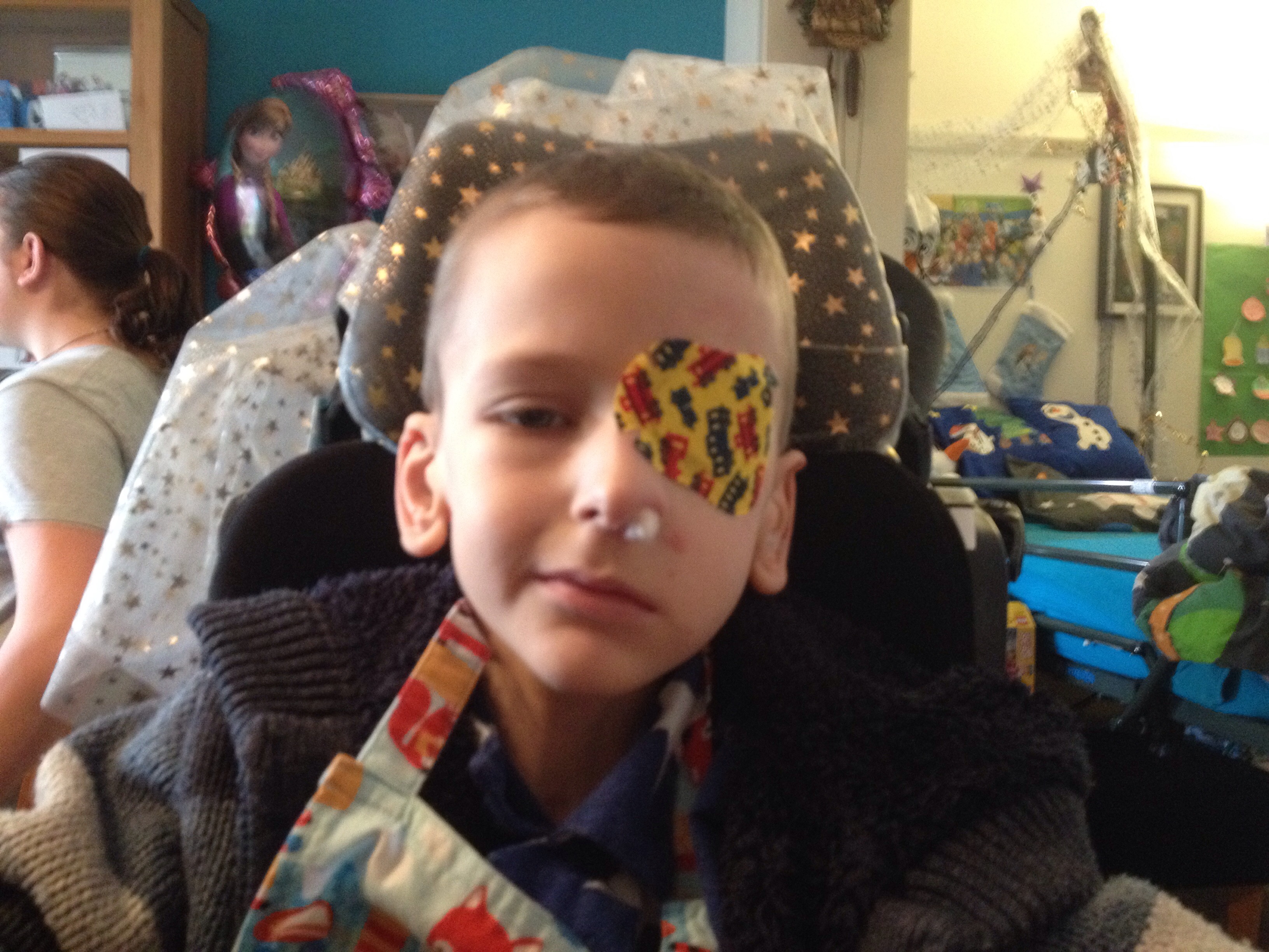 Zijn zicht is intussen weer achteruit gegaan: met twee ogen ziet hij alles dubbel, dus plakken we zijn linkeroog nu af met ortopads. Heel stoer!