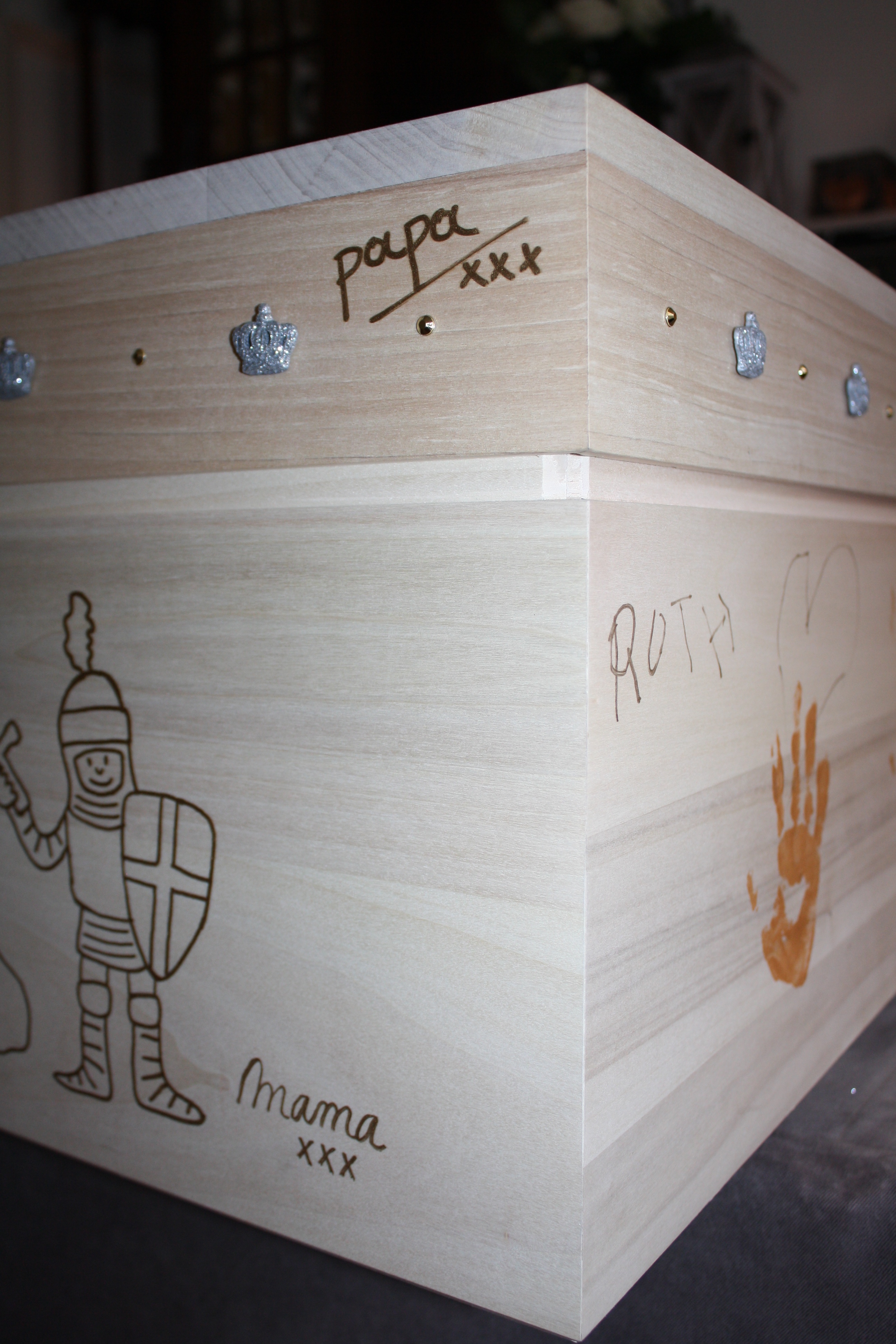 Enthousiast strooide ze blauwe zachte veertjes rond Lucas en zette ze de door haar gewonnen driekoningenkroon op zijn hoofd. Zeven witte rozen, een kleine Olafknuffel, twee brandende theelichtjes op batterijen en nog een laatste kus later sloten we samen de kist. We maakten er een mooie schatkist van: gouden handjes van Ruth met bijhorende hartjes, zilveren kroontjes, en Lucas’ favoriete ridder, in goud getekend.