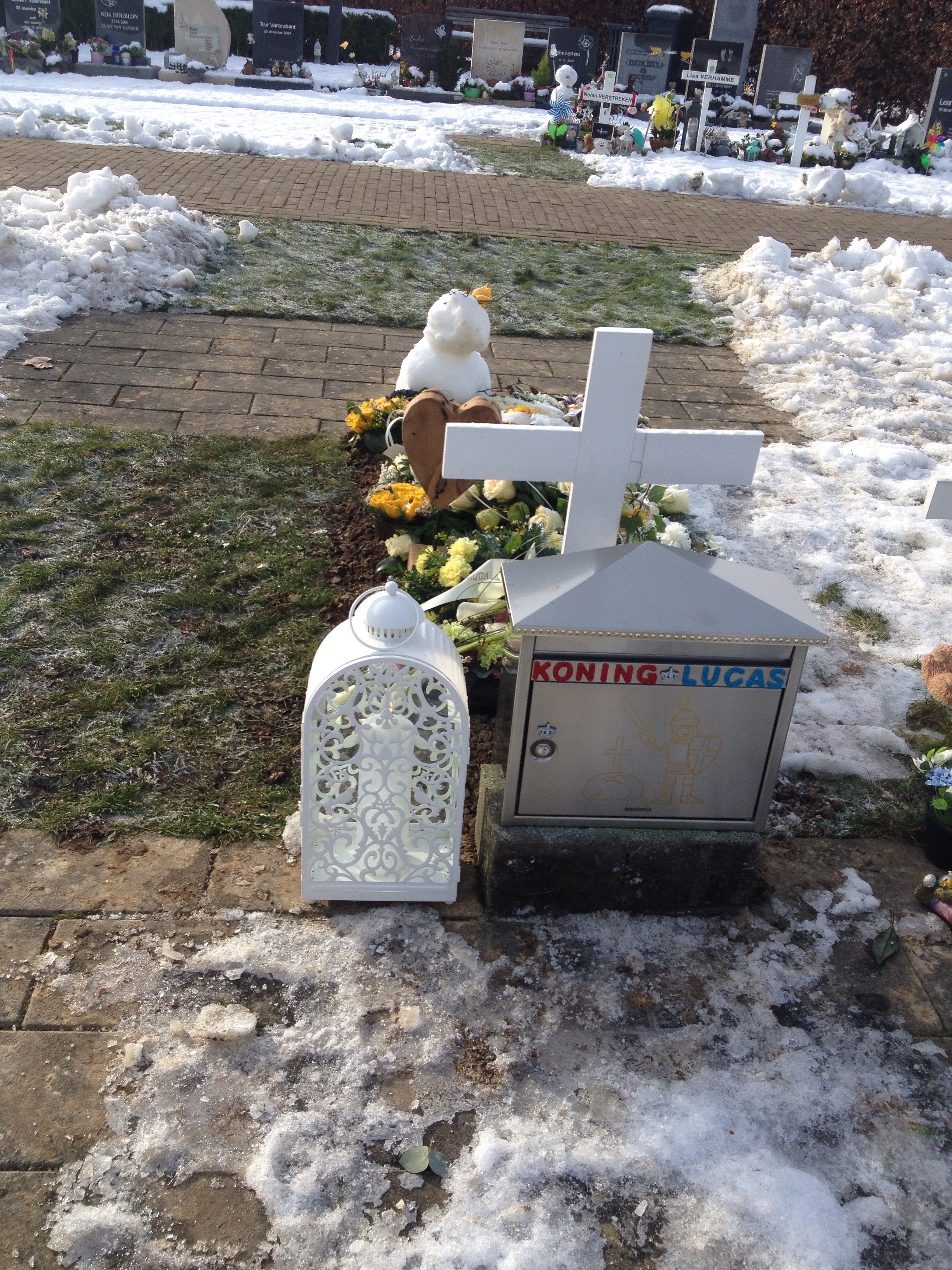 We gingen ook vandaag nog even naar het kerkhof (het kinderkerkhof van Diestseveld, op de Diestsesteenweg), met een speciale missie. We er zagen de afgelopen dagen veel uitgeregende tekeningen liggen. Tegelijk merken we dat er nog steeds veel kinderen tekenen, schrijven en knutselen voor 👑Lucas👑. Daarom plaatsten we vandaag een brievenbus bij zijn graf. Hopelijk gaan de kunstwerken op die manier niet verloren. Het deed deugd om te zien dat Olaf er nog steeds stond. De zon op de sneeuw had ook vandaag iets magisch.