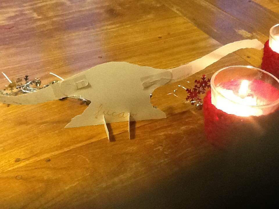 ” Wil je een dino kiezen? je mag uit al mijn dino’s kiezen die ik geknutseld heb…” Natuurlijk wilde ik dat wel en koos ‘dino diplodocus’ uit de kudde. Ik vroeg hem wel om zijn naam er op te schrijven. Met zijn oranje glitterpen signeerde ✨Lucas✨ zijn kunstwerk, mijn dino…